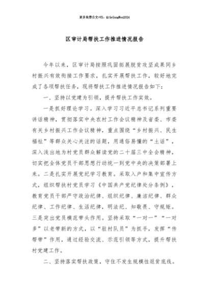 / 【七哥公文】2024年:区审计局帮扶工作推进情况报告+更多免费公文+VX:QiGeGongWen2024