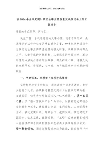 【七哥公文】2024年:在2024年全市党建引领民生事业高质量发展推进会上的汇报发言+更多免费公文+VX:QiGeGongWen2024