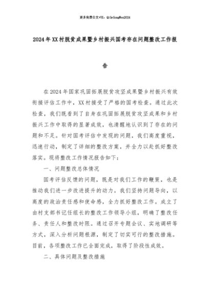 【七哥公文】2024年:2024年XX村脱贫成果暨乡村振兴国考存在问题整改工作报告+更多免费公文+VX:QiGeGongWen2024
