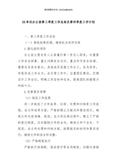 / 【七哥公文】2024年:XX单位办公室第三季度工作总结及第四季度工作计划+更多免费公文+VX:QiGeGongWen2024