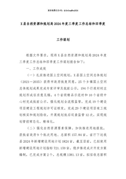 【七哥公文】2024年:X县自然资源和规划局2024年度三季度工作总结和四季度工作谋划+更多免费公文+VX:QiGeGongWen2024