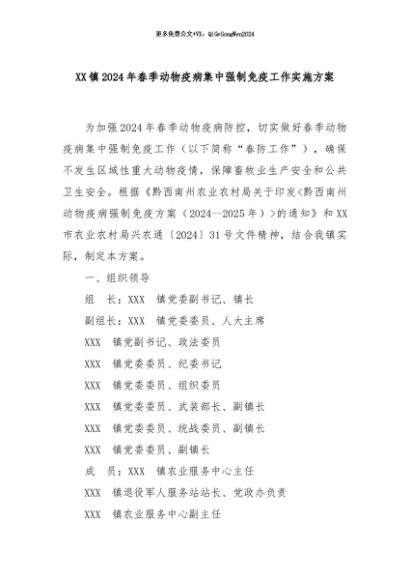 【七哥公文】2024年:XX镇2024年春季动物疫病集中强制免疫工作实施方案+更多免费公文+VX:QiGeGongWen2024