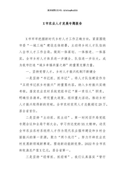 【七哥公文】2024年:X市农业人才发展专题报告+更多免费公文+VX:QiGeGongWen2024