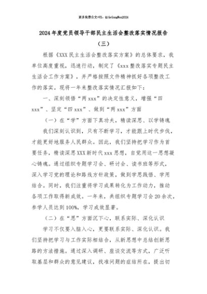 【七哥公文】2024年:2024年度党员领导干部民主生活会整改落实情况报告(三)+更多免费公文+VX:QiGeGongWen2024
