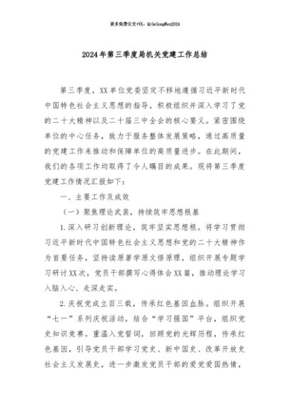 / 【七哥公文】2024年:2024年第三季度局机关党建工作总结+更多免费公文+VX:QiGeGongWen2024