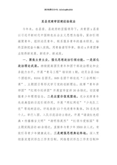 / 【七哥公文】2024年:某县党建带团建经验做法+更多免费公文+VX:QiGeGongWen2024