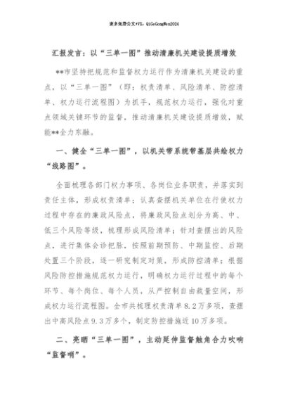 / 【七哥公文】2024年:汇报发言:以“三单一图”推动清廉机关建设提质增效+更多免费公文+VX:QiGeGongWen2024