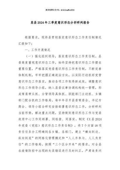 / 【七哥公文】2024年:某县2024年三季度意识形态分析研判报告+更多免费公文+VX:QiGeGongWen2024