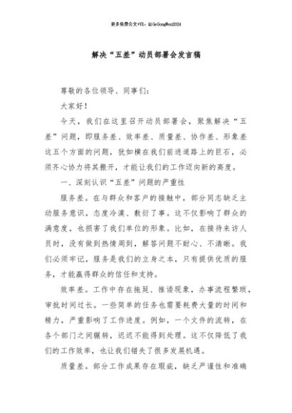 【七哥公文】2024年:解决“五差”动员部署会发言稿+更多免费公文+VX:QiGeGongWen2024