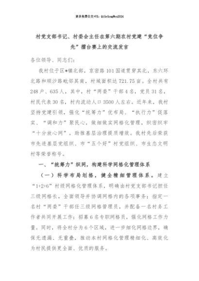 【七哥公文】2024年:村党支部书记、村委会主任在第六期农村党建“竞位争先”擂台赛上的交流发言+更多免费公文+VX:QiGeGongWen2024