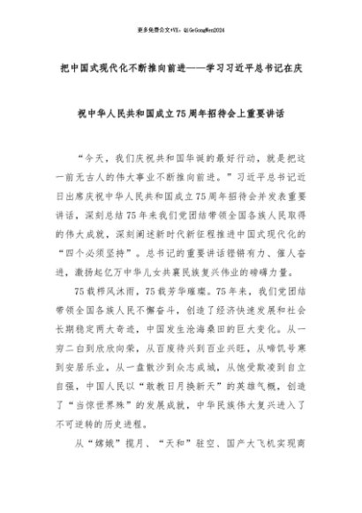 【七哥公文】2024年:把中国式现代化不断推向前进——学习习近平总书记在庆祝中华人民共和国成立75周年招待会上重要讲话+更多免费公文+VX:QiGeGongWen2024