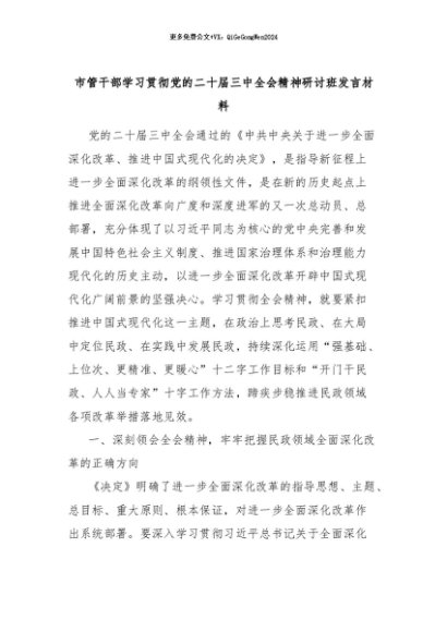 【七哥公文】2024年:市管干部学习贯彻党的二十届三中全会精神研讨班发言材料+更多免费公文+VX:QiGeGongWen2024