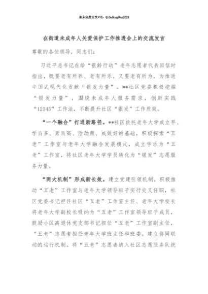 【七哥公文】2024年:在街道未成年人关爱保护工作推进会上的交流发言 (1)+更多免费公文+VX:QiGeGongWen2024