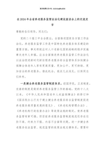 【七哥公文】2024年:在2024年全省养老服务监管法治化建设座谈会上的交流发言+更多免费公文+VX:QiGeGongWen2024