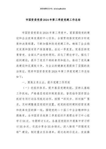 / 【七哥公文】2024年:市国资委党委2024年第三季度党建工作总结+更多免费公文+VX:QiGeGongWen2024