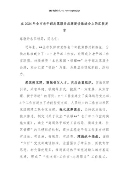 【七哥公文】2024年:在2024年全市老干部志愿服务品牌建设推进会上的汇报发言+更多免费公文+VX:QiGeGongWen2024