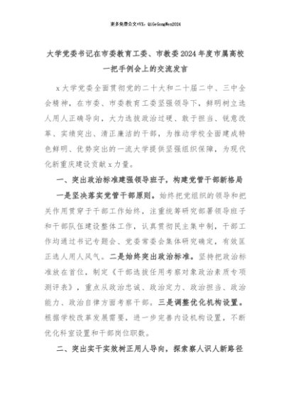 【七哥公文】2024年:大学党委书记在市委教育工委、市教委2024年度市属高校一把手例会上的交流发言+更多免费公文+VX:QiGeGongWen2024