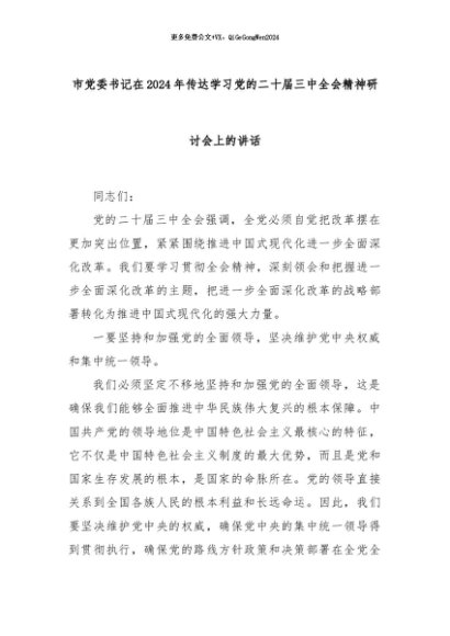 【七哥公文】2024年:市党委书记在2024年传达学习党的二十届三中全会精神研讨会上的讲话+更多免费公文+VX:QiGeGongWen2024