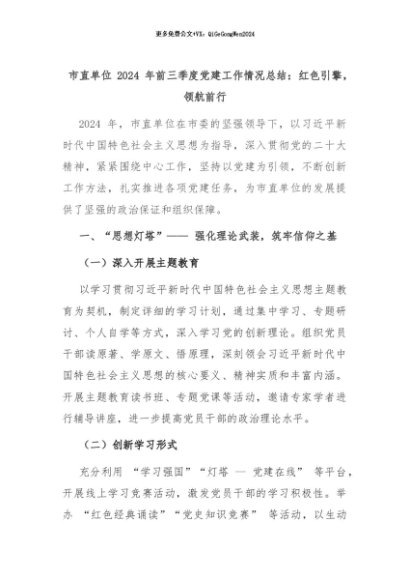 【七哥公文】2024年:市直单位 2024 年前三季度党建工作情况总结:红色引擎,领航前行+更多免费公文+VX:QiGeGongWen2024
