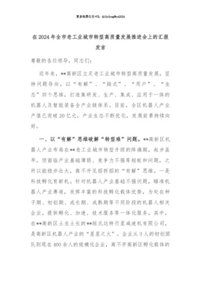 【七哥公文】2024年:在2024年全市老工业城市转型高质量发展推进会上的汇报发言+更多免费公文+VX:QiGeGongWen2024