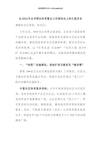 【七哥公文】2024年:在2024年全市群众体育重点工作推进会上的汇报发言+更多免费公文+VX:QiGeGongWen2024
