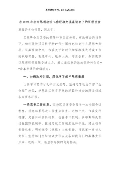 【七哥公文】2024年:在2024年全市思想政治工作经验交流座谈会上的汇报发言+更多免费公文+VX:QiGeGongWen2024