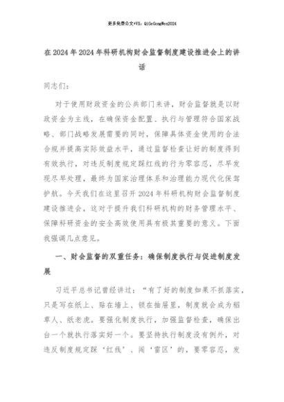 【七哥公文】2024年:在2024年2024年科研机构财会监督制度建设推进会上的讲话+更多免费公文+VX:QiGeGongWen2024