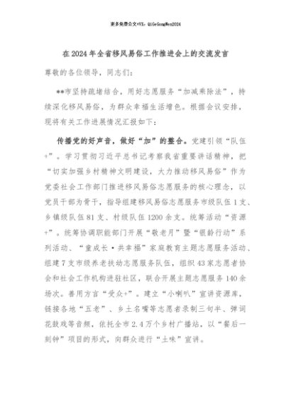 / 【七哥公文】2024年:在2024年全省移风易俗工作推进会上的交流发言+更多免费公文+VX:QiGeGongWen2024