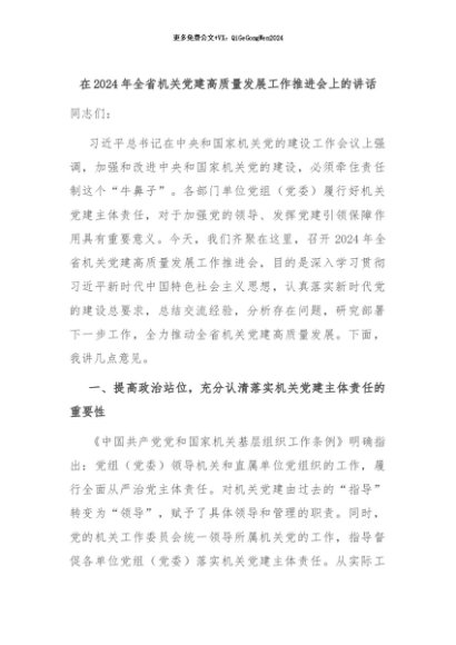 【七哥公文】2024年:在2024年全省机关党建高质量发展工作推进会上的讲话+更多免费公文+VX:QiGeGongWen2024