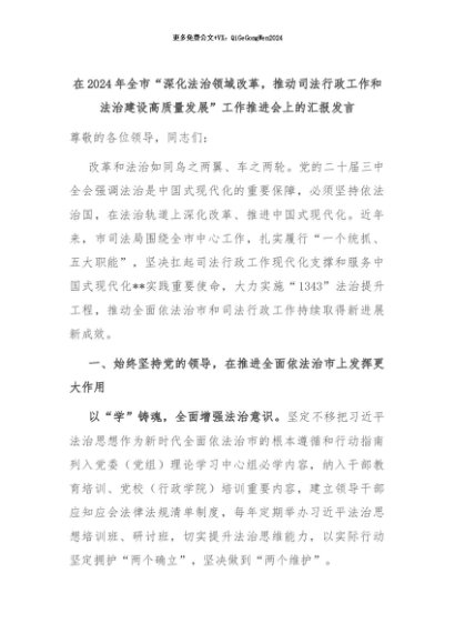 【七哥公文】2024年:在2024年全市“深化法治领域改革,推动司法行政工作和法治建设高质量发展”工作推进会上的汇报发言+更多免费公文+VX:QiGeGongWen2024