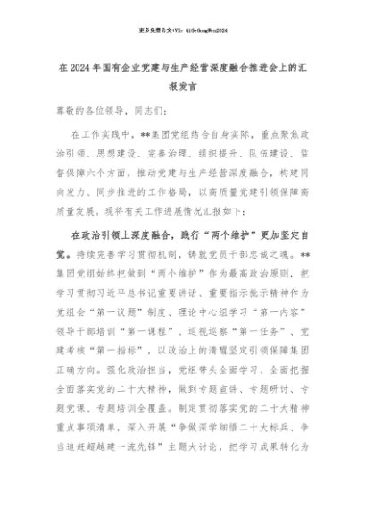 【七哥公文】2024年:在2024年国有企业党建与生产经营深度融合推进会上的汇报发言+更多免费公文+VX:QiGeGongWen2024