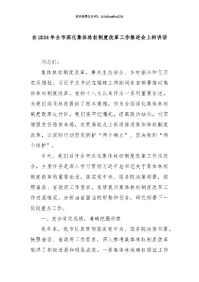 【七哥公文】2024年:在2024年全市深化集体林权制度改革工作推进会上的讲话+更多免费公文+VX:QiGeGongWen2024