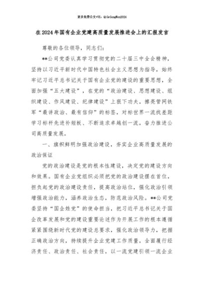 【七哥公文】2024年:在2024年国有企业党建高质量发展推进会上的汇报发言+更多免费公文+VX:QiGeGongWen2024