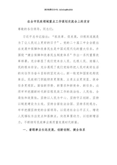 / 【七哥公文】2024年:在全市民政领域重点工作谋划交流会上的发言+更多免费公文+VX:QiGeGongWen2024