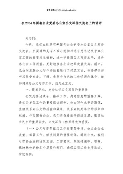 【七哥公文】2024年:在2024年国有企业党委办公室公文写作交流会上的讲话+更多免费公文+VX:QiGeGongWen2024
