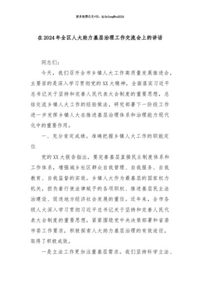 【七哥公文】2024年:在2024年全区人大助力基层治理工作交流会上的讲话+更多免费公文+VX:QiGeGongWen2024