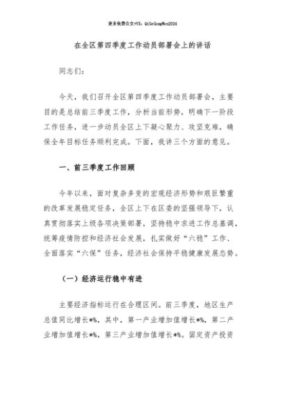 / 【七哥公文】2024年:在全区第四季度工作动员部署会上的讲话+更多免费公文+VX:QiGeGongWen2024