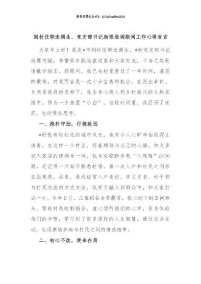 【七哥公文】2024年:到村任职选调生、党支部书记助理选调期间工作心得发言+更多免费公文+VX:QiGeGongWen2024