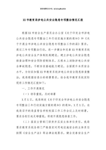 / 【七哥公文】2024年:XX市教育局涉电公共安全隐患专项整治情况汇报+更多免费公文+VX:QiGeGongWen2024