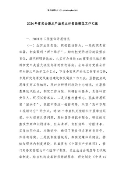 / 【七哥公文】2024年:2024年落实全面从严治党主体责任情况工作汇报+更多免费公文+VX:QiGeGongWen2024
