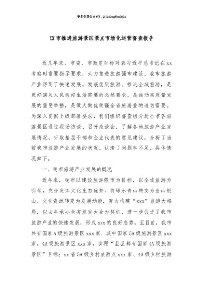 / 【七哥公文】2024年:XX市推进旅游景区景点市场化运营督查报告+更多免费公文+VX:QiGeGongWen2024