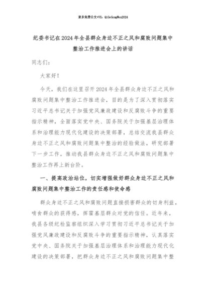 【七哥公文】2024年:纪委书记在2024年全县群众身边不正之风和腐败问题集中整治工作推进会上的讲话+更多免费公文+VX:QiGeGongWen2024