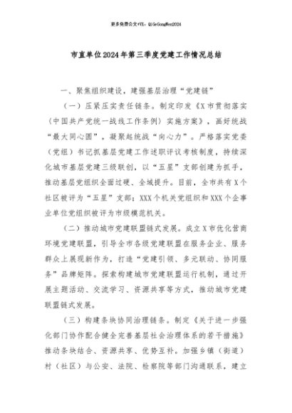 / 【七哥公文】2024年:市直单位2024年第三季度党建工作情况总结+更多免费公文+VX:QiGeGongWen2024