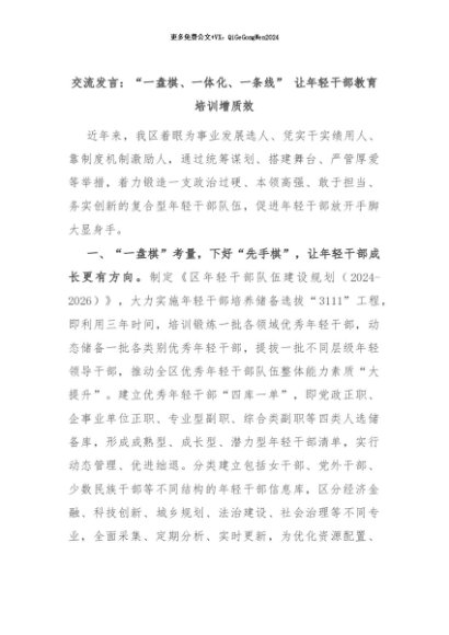 【七哥公文】2024年:交流发言:“一盘棋、一体化、一条线” 让年轻干部教育培训增质效+更多免费公文+VX:QiGeGongWen2024