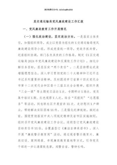 / 【七哥公文】2024年:某交通运输局党风廉政建设工作汇报+更多免费公文+VX:QiGeGongWen2024