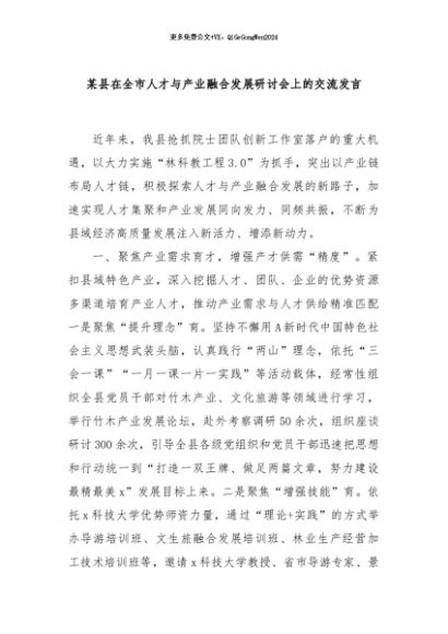 / 【七哥公文】2024年:某县在全市人才与产业融合发展研讨会上的交流发言+更多免费公文+VX:QiGeGongWen2024
