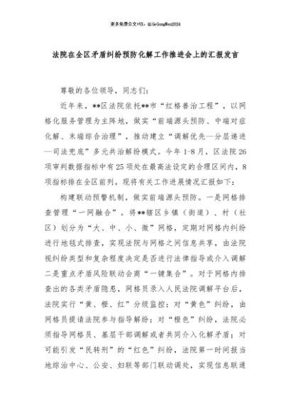 / 【七哥公文】2024年:法院在全区矛盾纠纷预防化解工作推进会上的汇报发言+更多免费公文+VX:QiGeGongWen2024