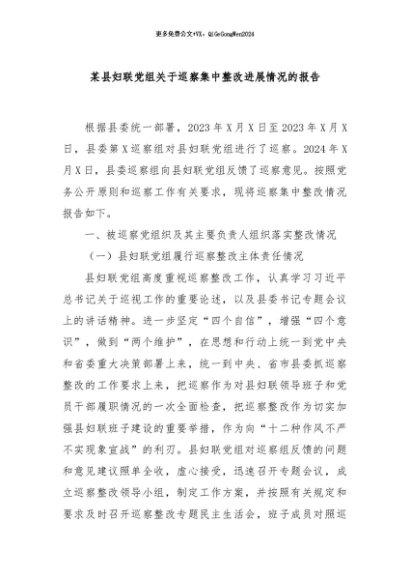 / 【七哥公文】2024年:某县妇联党组关于巡察集中整改进展情况的报告+更多免费公文+VX:QiGeGongWen2024