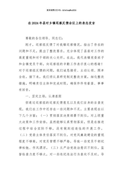 / 【七哥公文】2024年:在2024年县对乡镇巡察反馈会议上的表态发言+更多免费公文+VX:QiGeGongWen2024