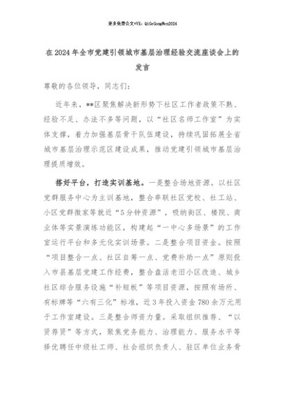 【七哥公文】2024年:在2024年全市党建引领城市基层治理经验交流座谈会上的发言+更多免费公文+VX:QiGeGongWen2024